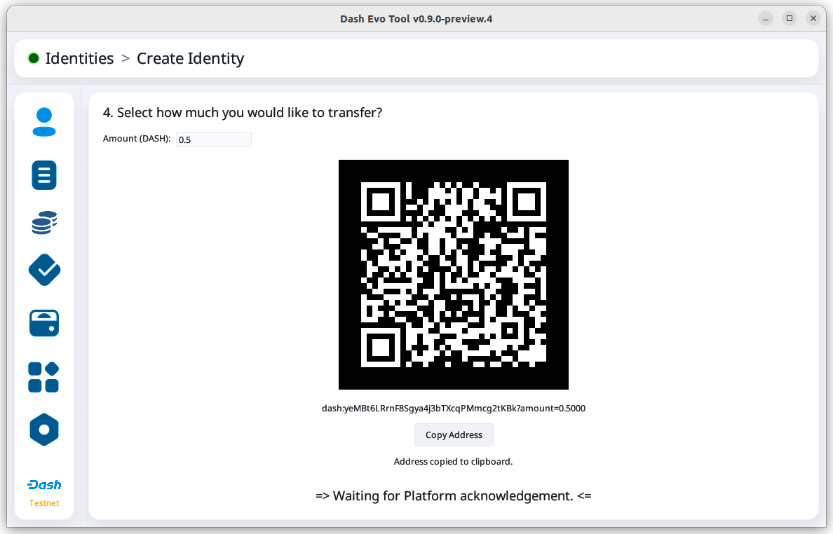 The status will change from “Waiting for funds” to “Waiting for Core Chain to produce proof of transfer of funds”. Then, the status will change to “Waiting for Platform acknowledgement” once the funds have been received and the identity registration process has started.