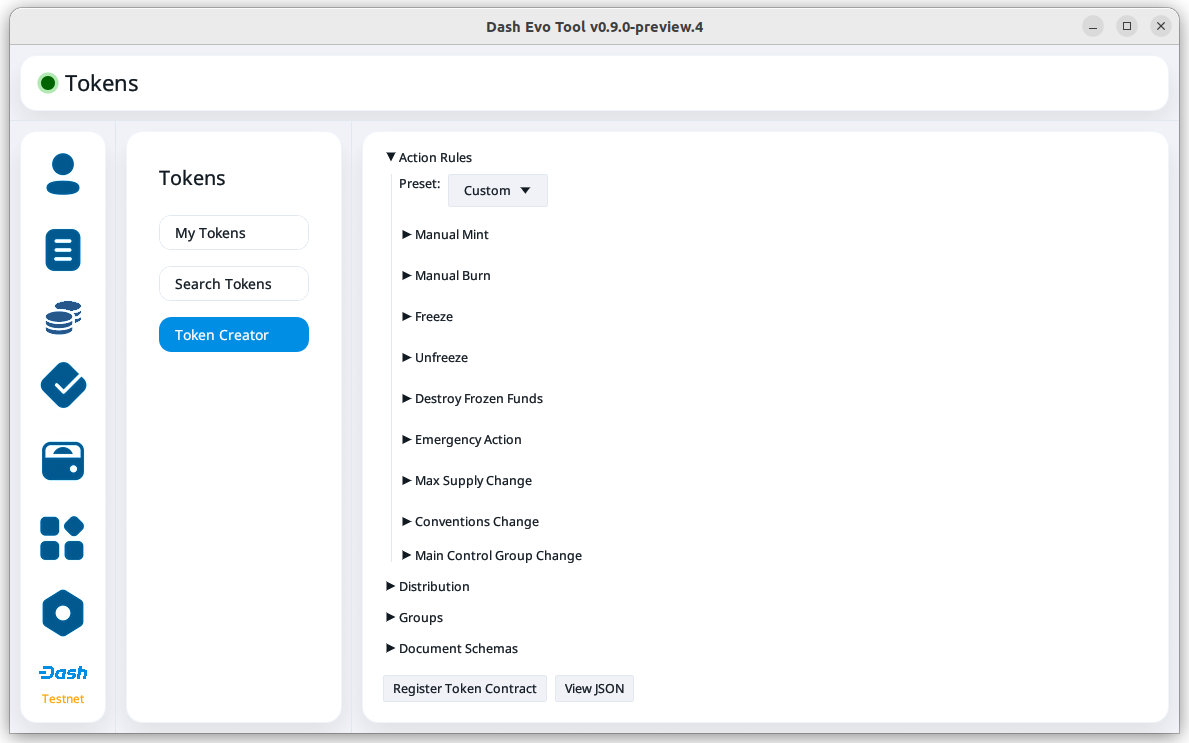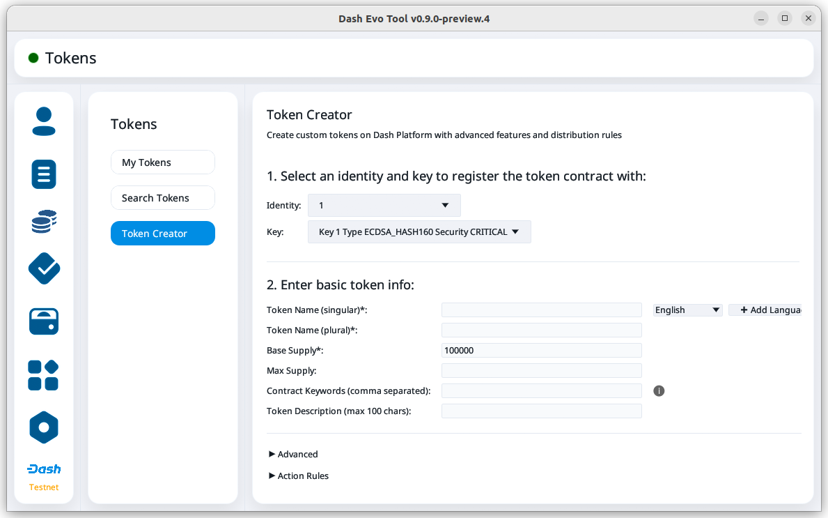 The Token Creator screen provides a comprehensive interface for creating and registering tokens on Dash Platform. It covers all configurable token attributes, ranging from basic supply details to advanced control mechanisms and distribution rules.