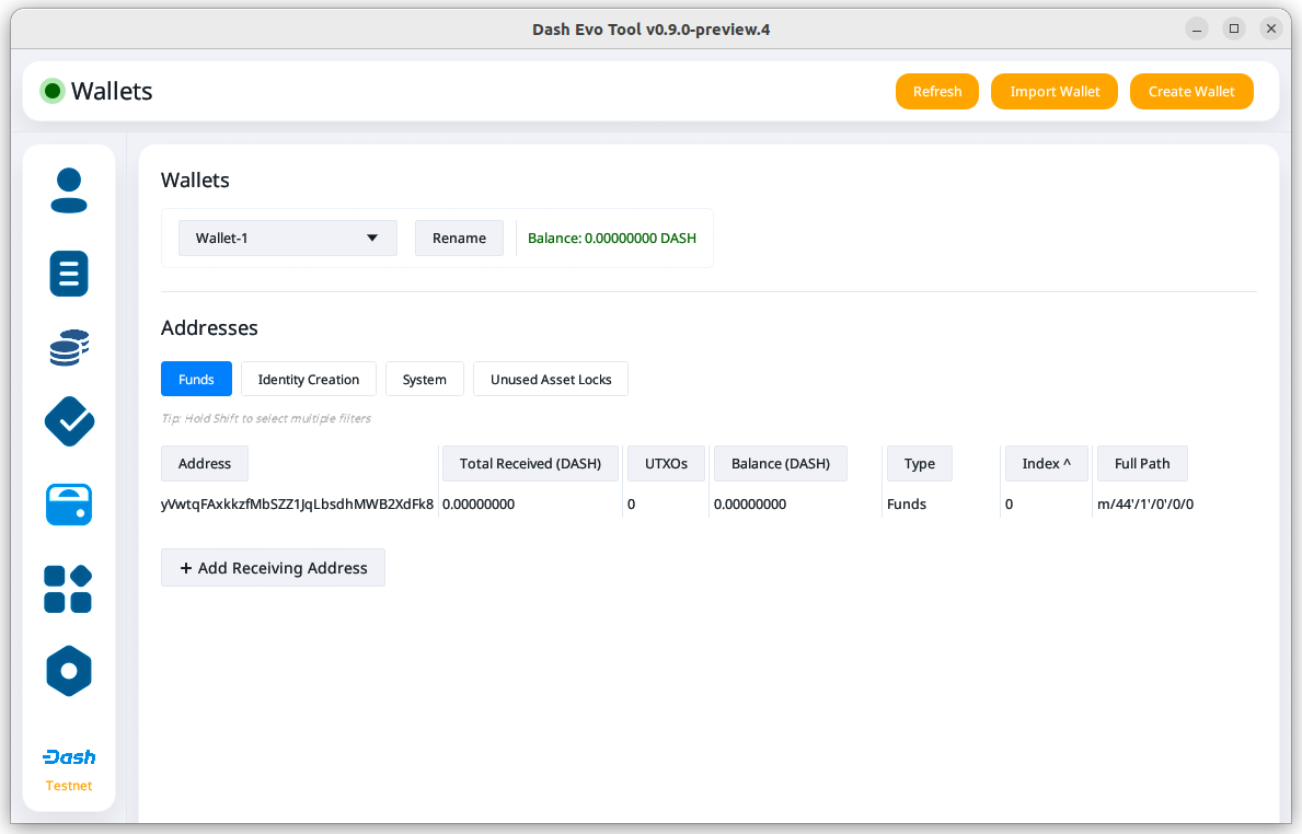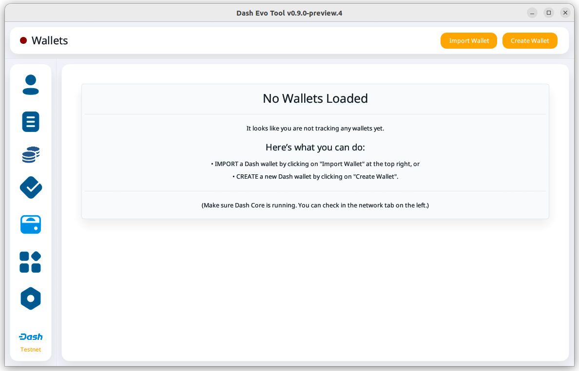 Since this tool adds watching-only addresses to Dash Core when creating identities, it is recommended to close all existing Dash Core wallets and create a new wallet for the Dash Evo Tool. Also, make sure to backup your Dash Core wallet.
