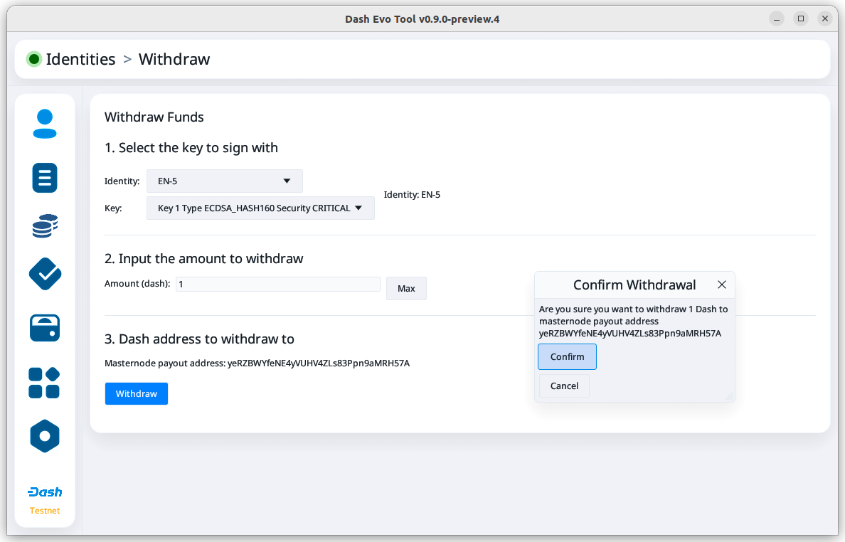 Once the identity is loaded, you can view its balance and details about its keys. For evonodes, you can also initiate withdrawals.